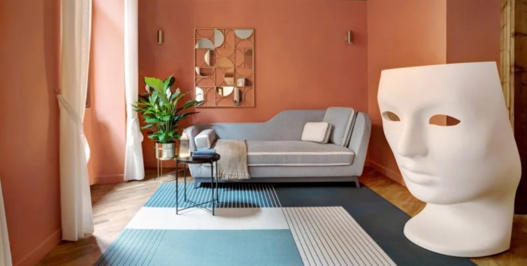 Sıcak, rustik tonlarda Roma'da tek yatak odalı bir daire olan Trevi House'un duvarlarını kalın pişmiş toprak ve kum rengi boyalar sarıyor. Oturma odası, geleneksel mermer heykelleri andıran çarpıcı, büyük boy bir heykelin altına yerleştirilmiş zıt doğrusal mavi ve krem rengi bir halıya sahiptir.