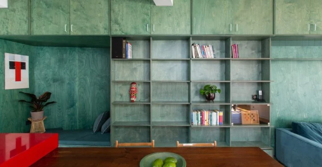 Yerel uygulayıcılar Point Supreme Architects bu canlı Atina dairesini yaşam, yemek ve mutfak alanlarını birleştiren tek bir açık alanı kapsayacak şekilde tasarladı. Daire, bölme eksikliğini telafi etmek için yeşil lekeli kontrplak duvarlar ve parlak kırmızı tepeli masalar gibi alanı tanımlamaya yardımcı olan renkli yerleşik mobilyalar içeriyor.