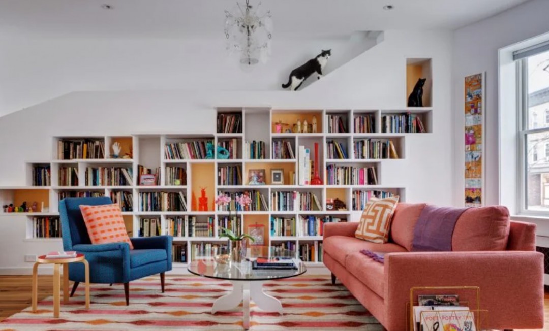 Amerikan stüdyosu BFDO Architect oturma odasına pembe, turuncu ve mavi sıçramalar ekledi. Odanın bir duvarı, sahibinin kapsamlı okuma koleksiyonunu barındırmak için parlak renkli nişlere sahip rengarenk bir kitaplık içeriyor.