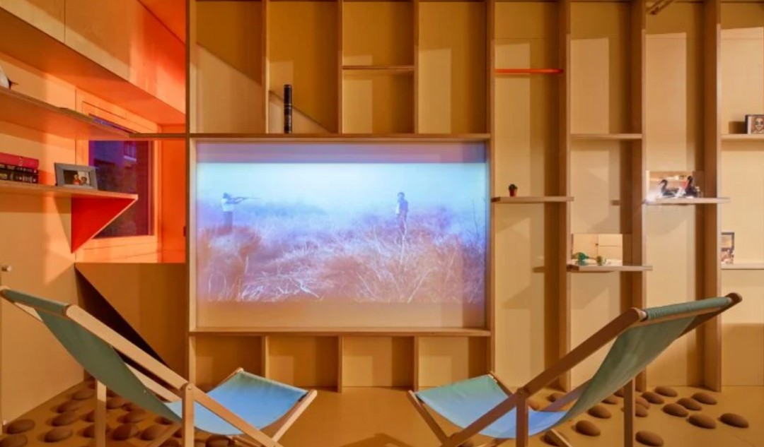 Flamingo pembesi duvarlar 1937 listesindeki Art Deco binasında bir Yunan sahil konutu olan Waterfront Nikis Apartments'ın oturma odasında merkez sahneyi alıyor. Mimar Stamatios Jannicis, deniz manzaralı bir oturma odasında neon pembe bir hamak ile yumuşak, kabarık bir kilim ve pembe saksıları birleştirdi.
