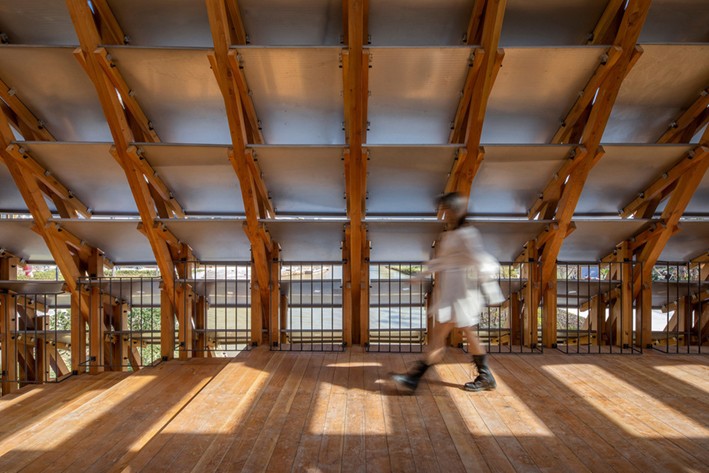 Kullanılan malzemeler sanayileşme standartlarına göre fabrikalarda üretildi. Ayrıca gerekli tüm ahşap ve metal bileşenler modern endüstriyel teknoloji ve yöntemlerle işlendi. Kurulum ve inşaat sırasında sadece üç ana kiriş büyük makineler tarafından kaldırıldı. Diğer tüm takip eden inşaat adımları, yerel bağlama yanıt olarak işçilerin elleriyle tamamen uyarlanabilir ve taşınabilirdi. Tüm inşaat süreci, yalnızca çevredeki inşaat sahaları ile etkin bir şekilde uyum sağlamakla ve verimli sanayileşmiş yöntemlerden yararlanmakla kalmadı, aynı zamanda kırsal sıcaklığın yanı sıra inşaatın “yerelleştirilmesini” de aktardı.