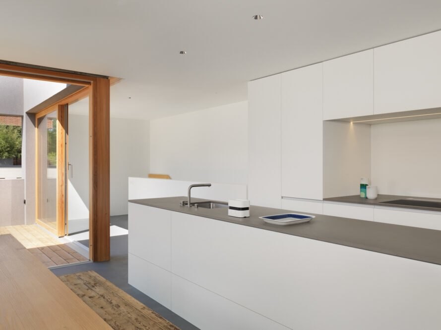 Konut sakinleri eve açık bir garajdan girmelidir, ancak bu ev daha fazla estetik için karaçam ahşap çıtalarla peyzajlı bahçeden ayrılmış. Tasarımcı geleneksel bir garaj inşa etmek yerine ev sahibine garajı gelecekte ekstra bir yaşam alanına dönüştürme fırsatı vermek istedi.