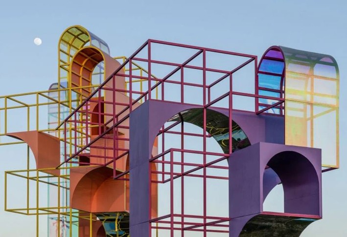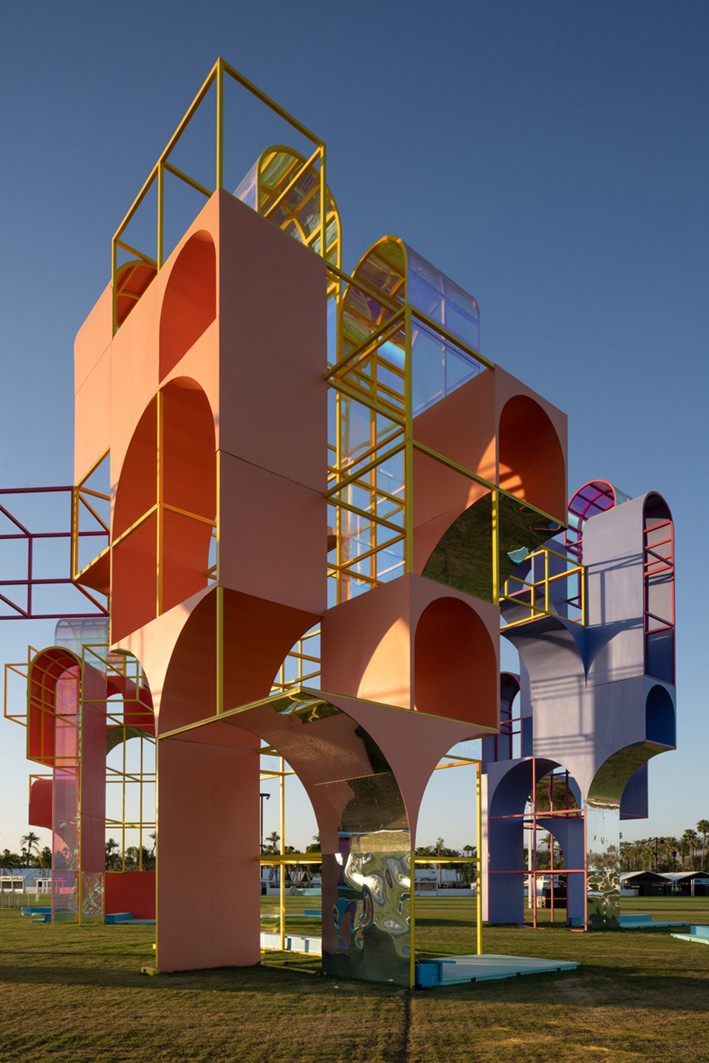 Coachella'da Architensions, The Playground'ın dört kulesinin her birini bir geometrik şekiller yığını olarak inşa ediyor. Bu blok modüller, formları ve renkleri açısından eğlenceli ve benzersizlerdir. Şekiller camgöbeği, macenta veya sarı renklerde dikroik bir filmle tamamlanmıştır. Cesur tonlar, güneş üzerlerinden parlarken çevredeki alanı renklendirir. Bu arada diğer modüller, festival müdavimlerinin onlarla etkileşime girmesi için aynalı bir yüzeyde tamamlandı. Geceleri bu aynalı bloklar, çevredeki performansların ve etkinliklerin ışığıyla parlıyor.