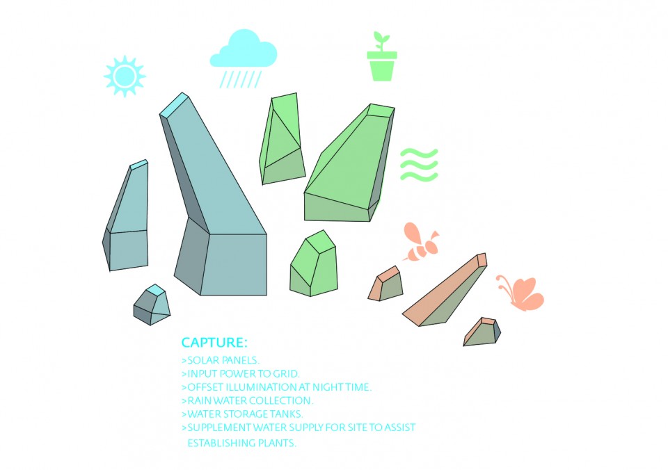 Güneş panellerinin aydınlatma ve elektrik için güç sağlamasıyla birlikte, kuş yuvaları ise yaban hayatı için bir tür barınak işlevi görmekte. Yer aldığı alanda ağaçların ve ekili arazilerin zaman içerisinde gelişerek bu heykelleri sarmasıyla birlikte; enstalasyon çevrede önemli bir özellik olmaktan ziyade peyzajın bir parçası olmayı hedefliyor.
