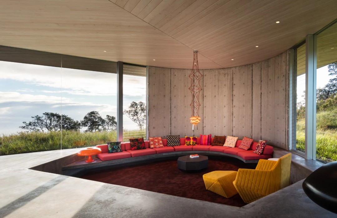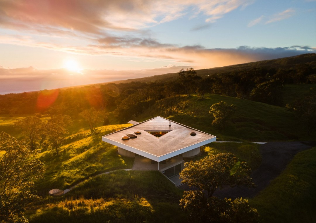 100 dönümlük yuvarlanan çimenli tepelerle çevrili olan ev Büyük Ada, Paauiro'daki Mauna Kea yanardağının yamaçlarında kuzeye bakıyor. San Francisco stüdyosu Craig Steeley Architecture, "Sahipleri, Hamakua Sahili'nin rüzgarlı kır doğasını yansıtan bir ev istedi. Alçak çatı kareydi, ancak yaşam alanı yuvarlaktı." diyor. Üçgen bir düzlemde düzenlenmiş.