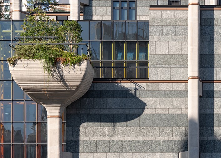 Yapısal kolonların dikey ızgarası tasarımın tanımlayıcı özelliği haline geldi ve geliştirme içinde kapsamlı bitkilendirmeyi entegre etme fırsatı sundu. Her sütunun tepesinde, 70'den fazla farklı ağaç türüne sahip bir ekim alanı bulunuyor. Ortaya çıkan farklı yüksekliklerde hacimler kümesi; otopark, ofis alanları, mağazalar, bir okul, otel odaları ve sanat galerilerini içeriyor. Tarihi binalar, yeni gelişme içinde odak noktaları olarak entegre edilecek.