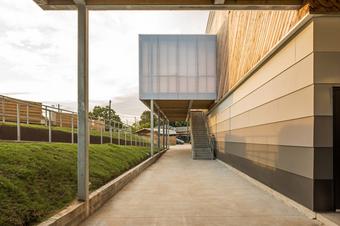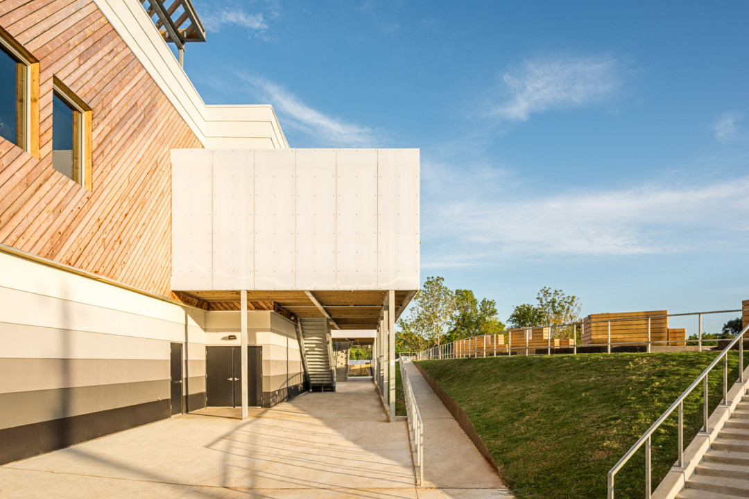 WOMH’nin tasarımı, endüstriyel yapıların estetiğinden ilham alıyor. Ana bina, fiber çimento kaplama ile kaplanmış; eğimli çatı ve açılı sedir çıtalar, gölgeleme ve ritmik cephe düzeni sağlıyor.
