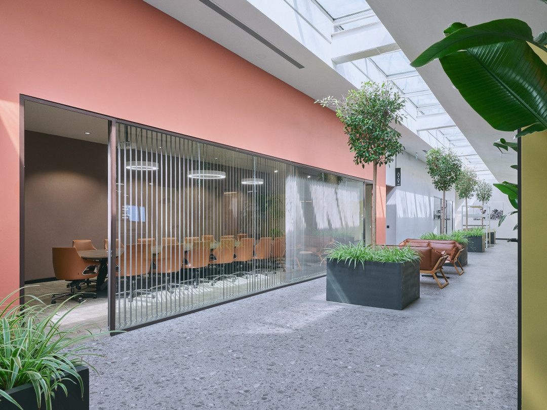 Backhaus Üretim ve Yönetim Tesisi’nde yer alan yatakhane ve ortak alanlar, tesisin 24 saat çalışmasıyla beraber vardiyalı çalışan personelin dinlenme ve sosyal ihtiyaçlarını karşılayacak şekilde tasarlandı. Bu sayede çalışanların verimli dinlenme alanlarına erişimi sağlanırken, işlevsel ve konforlu bir çalışma ortamı oluşturulmuş. Tesisin idari katında yer alan çatı ışıklığı, doğal ışığın mekâna derinlemesine nüfuz etmesini sağlayarak iç tasarımın karakterini belirleyen bir unsur olarak öne çıkıyor. Çatıdan gelen ışık, gün boyu değişen ışık oyunlarıyla mekâna dinamizm kazandırırken, ferahlık ve açıklık hissini güçlendiriyor. Bu ışıklık, "iç sokak" olarak adlandırılan ve çalışanlar ile ziyaretçiler için bir toplanma, etkileşim ve dinlenme alanı işlevi gören merkezi bir mekânın oluşumuna katkı sağlıyor. Ofislerin ve toplantı alanlarının çevresinde konumlandığı bu iç sokak, idari katın dolaşım ekseni olarak kurgulanmış. Kullanıcıların kolayca yön bulabileceği ve farklı birimlerin etkileşime geçebileceği bu ortak alan, kısa molalar ve sosyal iletişim için ideal bir ortam sunuyor. Çatı ışıklığı ise bu benzersiz alanın ruhunu ve estetik kimliğini tanımlayan en önemli tasarım ögesi olarak dikkat çekiyor.