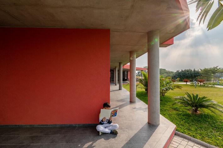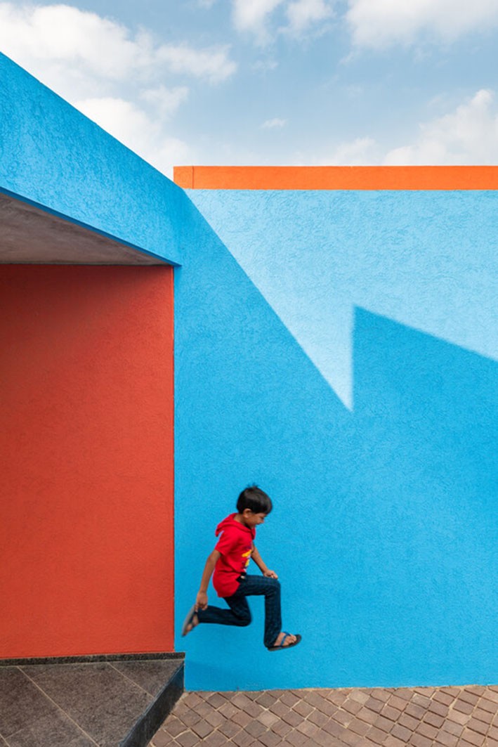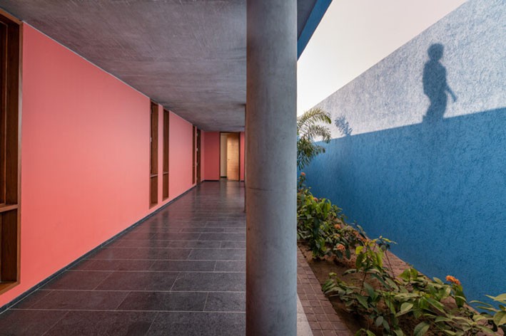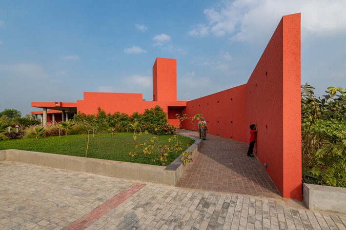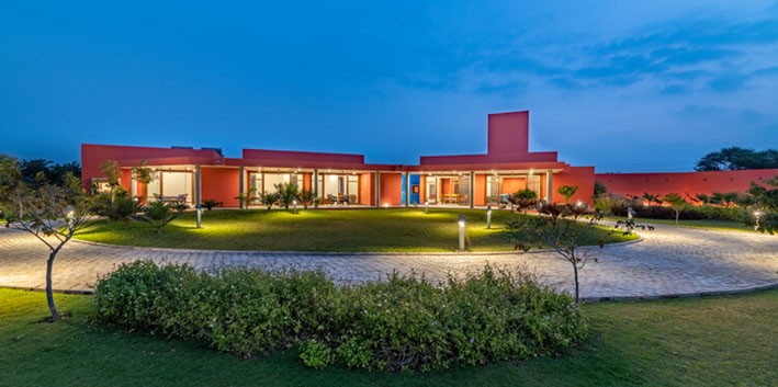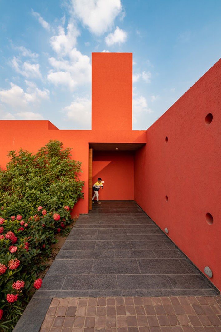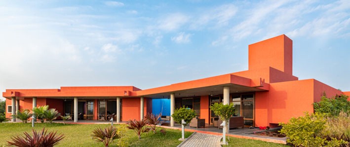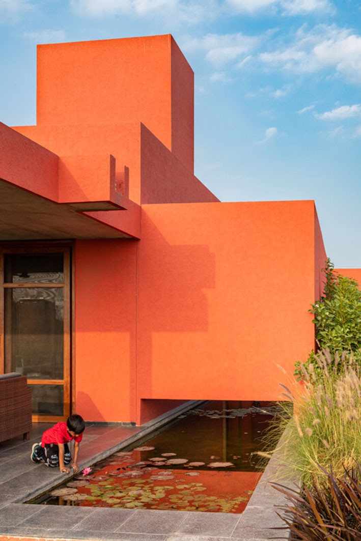 Mehsana'nın eteklerinde yer alan bu çiftlik evi, tek bir gereksinimi olan müşteriler için inşa edildi. Bu nedenle mimarlara çeşitli malzemeleri, renkleri ve yapım tekniklerini keşfetme konusunda tam bir özgürlük verildi. Ev, pasif tasarım ilkelerine göre tasarlandı. Hindistan'ın batı kesiminde yer alan Gujarat'ın sıcak ve kuru iklimi için hava ve gün ışığının doğal akışını en üst düzeye çıkarmak gerekiyordu. Açık ve inşa edilmiş alanların geçişi, evin her yerinde renklerin kullanımını, aynı zamanda ışık ve gölge oyununu vurguluyor.