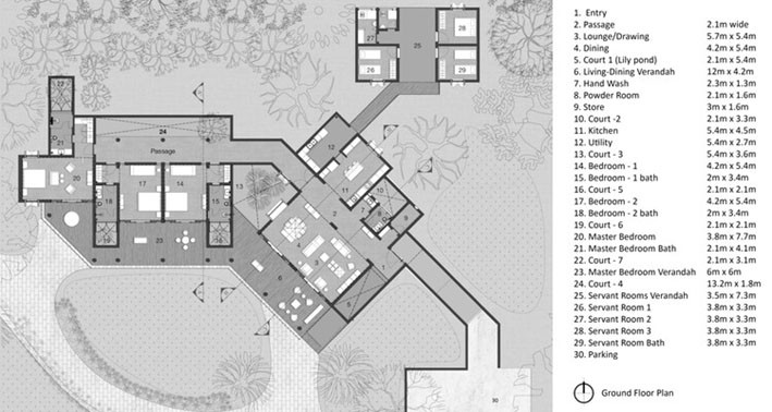 Ev, oturma-yemek alanı, mutfak ve üç yatak odası ile tek katlı bir yapıdır. Ana caddeden yapıya yaklaşırken, ilginç desenler oluşturan dairesel oyuklara sahip doğrusal bir duvar boyunca yürünür. Evin girişinde nilüferli avlu sizi karşılar. Bu kamusal ve özel alanların birleştiği yerde bir avlu daha bulunmaktadır. Yatak odalarının girişleri, her yatak odası için özel kortlar ile birlikte doğrusal bir avlu ile çevrilidir. KD köşesinde, doğrudan mutfakla bağlantılı hizmetli odaları bulunmaktadır. Merkezi omurga, evin önemli bir dolaşım alanıdır. Varış alanında lineer olarak başlar ve evin ana girişinde bükülür. Daha sonra fonksiyonel alanlar boyunca hareket eder ve yatak odalarına yol açar. Yön değişikliği, kullanıcıya daha özel bir bölgeye gittiklerini bildirir. Bu merkezi omurga boyunca kullanıcılar, yolculukları boyunca ilginç bir ışık ve gölge deseni görebilirler. Tüm bu inşa edilmiş alanlar, ön taraftaki peyzajlı bahçe ile yatay bir bağlantı kuracak şekilde dış verandaya bağlanmaktadır.