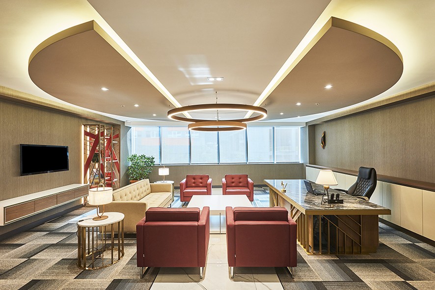 İşverenin isteği doğrultusunda farklı fonksiyonlar ve departmanların dağılımının üç ayrı kata yayıldığı planda yönetim ofisi girişi, dairesel formda tasarlanarak karşılama ve bekleme alanları şekillendirilmiş. Bu anlayışla tavan, aydınlatma ve mobilyalara da bu organik formlar yansıtılarak mekanın kendi içerisindeki üç boyut etkisi devam ettirilmiş. 1.katta firmanın ürünlerinin yer aldığı showroom ve toplantı odaları, 2.katta dinlenme odaları ve özel banyoları ile beraber yönetici odaları, yönetim kurulu toplantı odası, pazarlama ve satış departmanları ile tüm ofis çalışanlarının kullanımına yönelik kafe ve oturma alanları tasarlanmış.