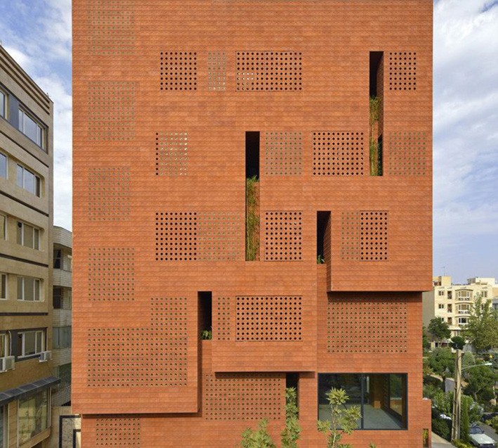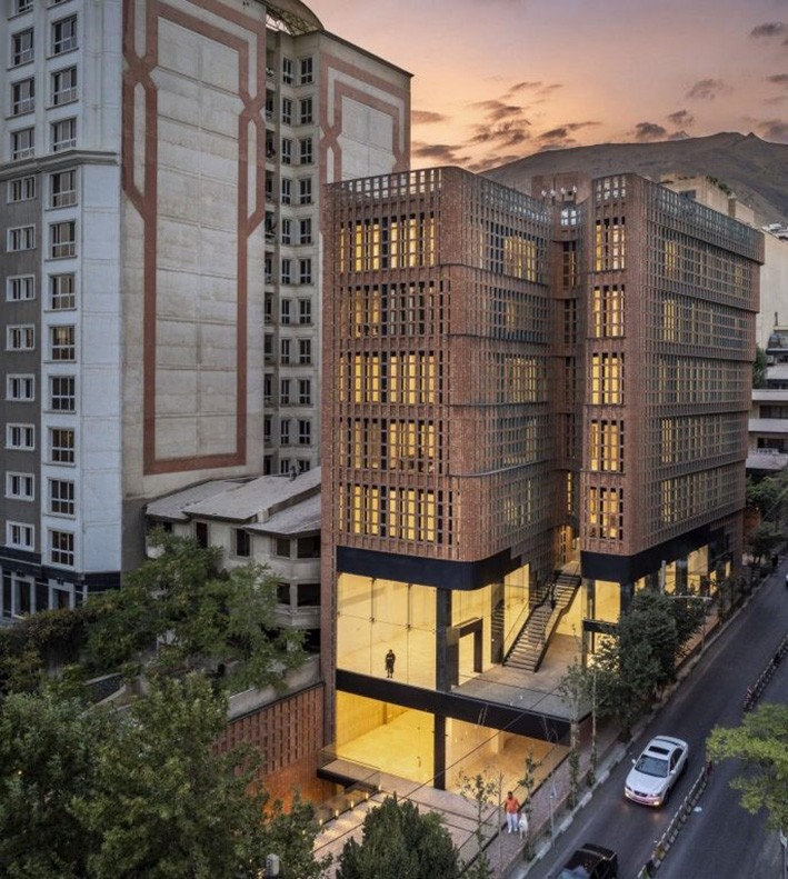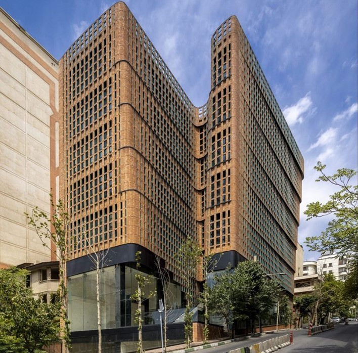 Stüdyo, delikli tuğla tasarımını kullanarak, çift cidarlı bir ofis kulesi geliştirdi. Bu delikli tuğlalar ışığı filtrelemesinin yanı sıra, doğal olarak havalandırılan bir ortam sağlar. Hava, bu boşluklara yerleştirilen bitkiler tarafından filtrelenir ve soğutulur, bu da Tahran'ın kuru ve kirli iklimine olumlu bir şekilde hitap eder.