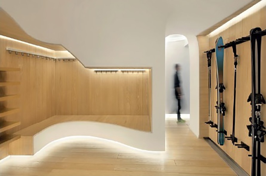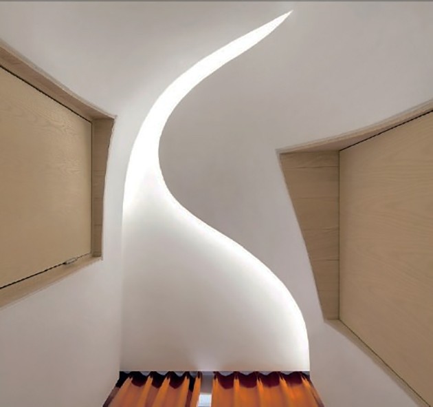 Mekânlara sıcak, doğal bir öge katmak için ahşap nişler, duvarlar ve raflar beyaz kaplamaların içine yerleştirilmiş. Bu alanlar dinlenme, eğlenme veya sanat eserlerini sergileme alanları olarak kullanılıyor. Tavanlar zeminden beş santim yukarıda ve beyaz mekân kaplamaları ile açık renkli ahşap zeminin arasındaki farkı göstermek için arkadan aydınlatılmış. Mekân kaplamalarının üst kısımları bazı yerlerde birbirinden kaydırılmış olarak uygulanmış ve yine LED’ler ile aydınlatılmış. Dolaylı olarak aydınlatılan tavan ile genel aydınlatma sağlanıyor, mekânların yerleşim düzeni öne çıkartılıyor ve istenilen ortam sağlanıyor.