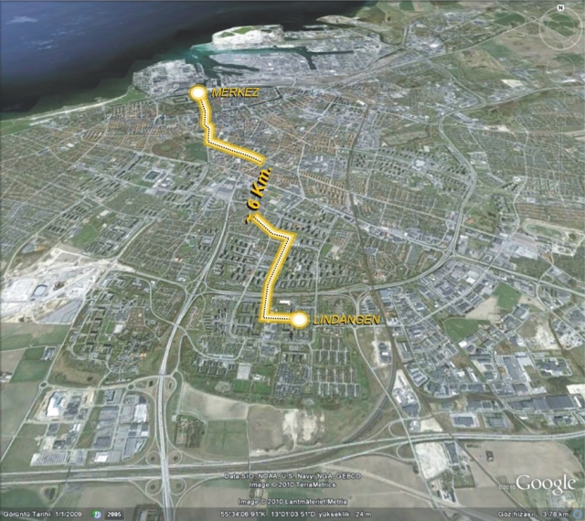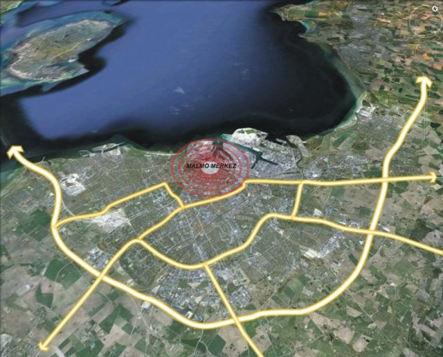 Malmö, Güney İsveçi’in ticari merkezi konumunda olan yaklaşık 300.000 nüfuslu bir liman kentidir. Kentin fiziksel dokusu yarım daire şeklindedir ve yaya yolları bu formu dik kesmektedir. Bu yapı kentte yaşayan insanların hangi konumda yaşıyor olurlarsa olsunlar herşeye ve heryere yürüme mesafesinde yakın olduklarını hissetmelerini sağlamaktadır. Kentin en dış çeperlerindeki konutlardan bile kamusal açık alanlardan, yeşil alanlardan geçerek kesintiye uğramadan kent merkezine ulaşmak mümkün kılınmıştır. Yarım daire şeklindeki transit taşıt yolları yayayı yormayacak şekilde yaya geçitleri ile aşılmış, hemzemin taşıt yollarında ise bisikletli ve yayaya öncelik veren düzenlemeler yapılmıştır.