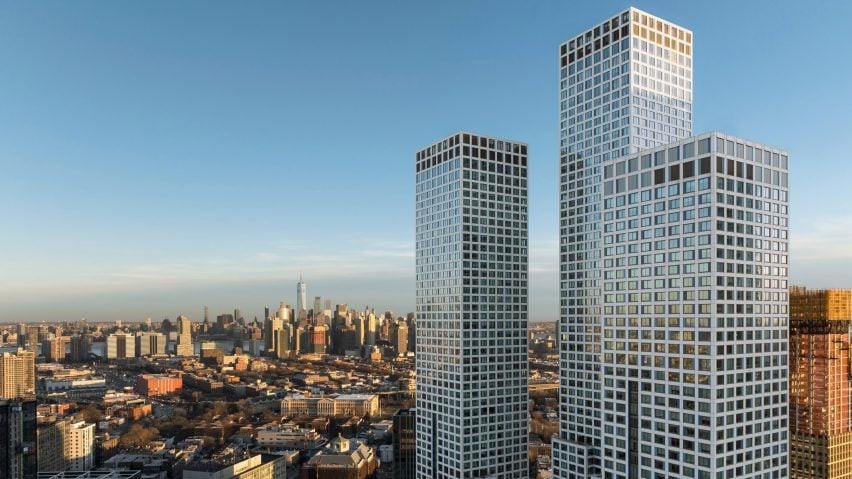 Her bir yapının cephesi, beyaz metal paneller ve küçük pencereler ile donatılmış durumda. Handel Architects, yüksekliği bölmek ve kütlesel algıyı değiştirmek amacıyla cephe boyunca dikey cam şeritler yerleştirmiş. Ayrıca kuleler, yükseldikçe kademeli şekilde geriye çekiliyor, bu da mimari silüeti daha zarif hale getiriyor.