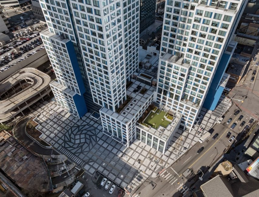 Projenin zemin seviyesinde yer alan açık alanlar, kulelerin lobileriyle doğrudan bağlantılı. HWKN ve Handel Architects, binaların zemine “doğrudan bağlanmasını” sağlayarak kamusal plaza alanları tasarlamış. Böylece hem kullanıcı dostu hem de sosyal etkileşimi teşvik eden bir yaşam alanı oluşturulmuş.