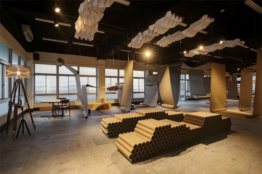 Yerel mimarlık stüdyosu J.C., kraft kağıt rulolarını kullanarak Tayvan, Taipei’de konumlanan Happier Cafe‘de çeşitli dinamik alanlar yaratıyor.