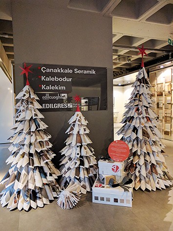 ‘A! Ne Hoş’ ekibi, Kalebodur'un eski kataloglarından, yılbaşı ağaçları tasarladı. Halen Kale Fulya Mağazası'nda sergilenen kış köşesinde, ileri dönüşüme (Upcycling) dikkat çekiliyor.