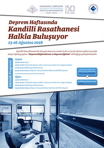 Her yıl 17 Ağustos Depremi’nin yıldönümünde deprem tehlike ve riski konusunda farkındalık yaratmak üzere etkinlikler düzenleyen Boğaziçi Üniversitesi Kandilli Rasathanesi’nin 13-16 Ağustos Deprem Haftası 150. Yıl Etkinlikleri’ne katılmak isteyenler, https://goo.gl/Dbj5MB adresindeki formu doldurarak veya kandilli150yil@boun.edu.tradresine e-posta göndererek programa kayıt olabilecekler.