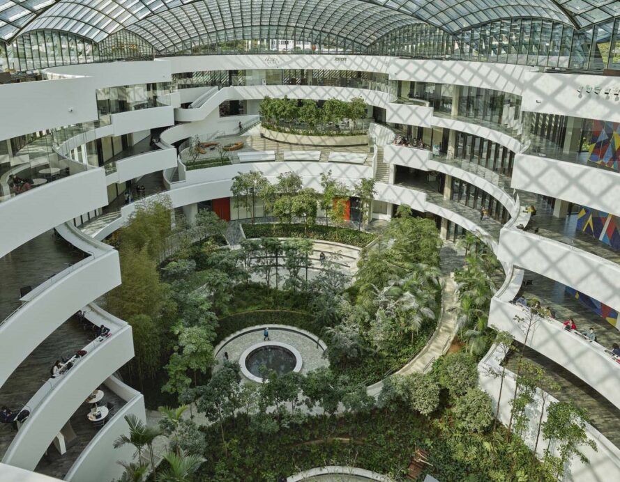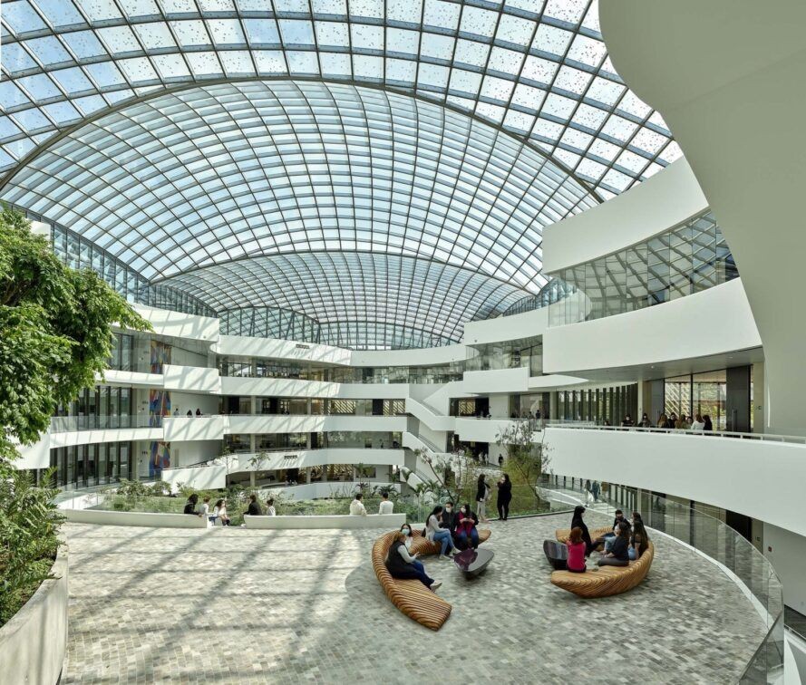 Atrium Bahçesi, kompleksin işbirliği ve öğrenme alanlarının merkezinde yer alıyor. Bir çevre kontrol sistemi, alanı optimum sıcaklıkta tutuyor. Bu şekilde nemi kontrol etmek, enerji tüketimini en aza indirmek ve alanı mümkün olduğunca konforlu hale getirmek için atriyum gerektiği kadar yavaş bir hızda soğutuluyor. Binalardaki bitki ve insan sağlığı söz konusu olduğunda nem kontrol edilmeli ve katı laboratuvar ortam koşullarına uygun olmalıdır. Bir yangın sırasında iç mekan termal tabakalaşmasını modellemek ve duman emisyonlarını simüle etmek için dinamik bilgisayar simülasyonunu kullanılmış.