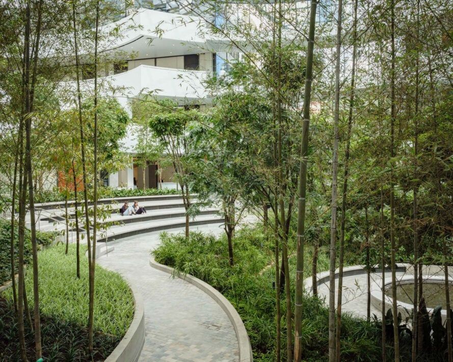 Buradan bahçeye kuzeyde bir bambu korusu ve güneyde bir palmiye korusu ile sokak seviyesine kadar uzanıyor. Yerli bir tür olarak korunan büyük bir Jatoba ağacı, inşaat sırasında korunmuş ve ana girişin yanına yerleştirilmiş. Yağışları ve akışı en aza indirmek için taşıt yolları ve kaldırımlar için geçirgen kaldırımlar kullanılmış.