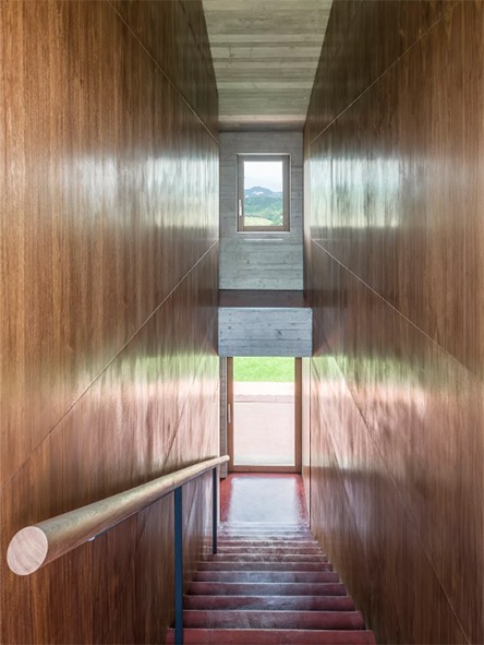 Çevresindeki peyzaja hakim olan ev kırmızı beton zemin üzerine oturuyor. Tek bir konut olan ev çekirdeği, yeni yapılar ve tarihi katmanlar arasında dolaysız gerçekleşen bir diyaloğu geri getirerek peyzajda bu alana merkezi bir rol kazandırıyor.
