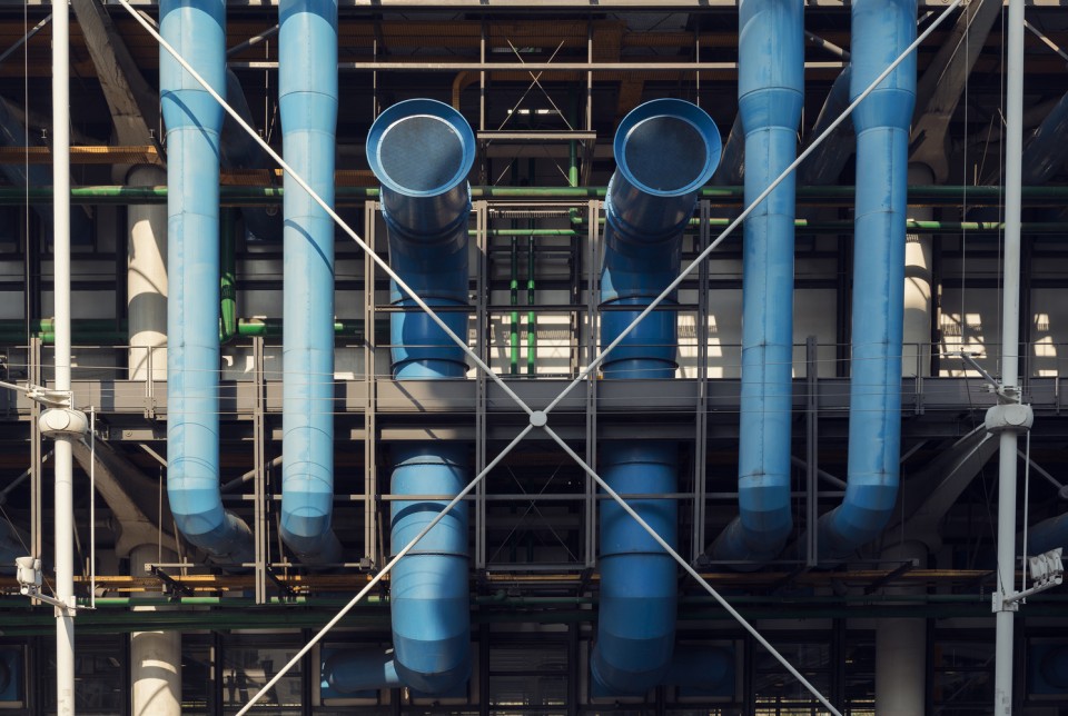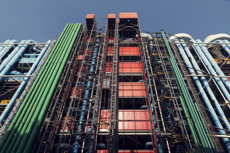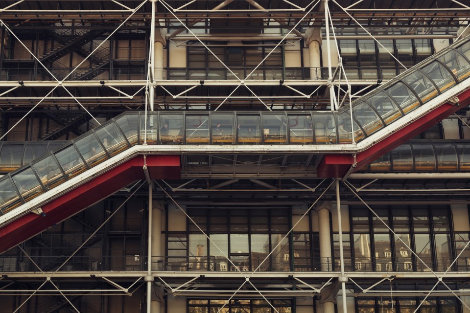 Bir zamanlar, “mimari bir korku” olarak nitelendirilen Pompidou Merkezi , mimari ifadenin ve yenilikçiliğin ikonik bir örneği haline gelmiş, Gallardo'nun, Renzo Piano / Richard Rodgers tasarımının fotoğrafları, yapının bütünlüğü içinde göz ardı edilmeksizin, binanın kesişen çizgilerinin geometrik düzenini ve rasyonalitesini bir ayrıntı düzeyinde ele geçiriyor.