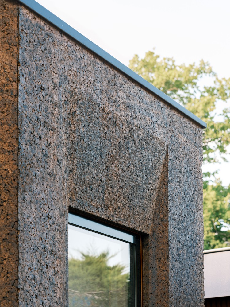 Ahşap yapı düşük yoğunluklu mantar yalıtım tabakası, bir mantar harcı tabakası ile birleştirilmiş yüksek yoğunluklu mantar dış tabakası ile yalnızca mantarla kaplanmış. Bu montaj nefes alan duvarlara, sağlıklı ve konforlu bir iç ortam iklimine katkıda bulunur. Kullanılan mantar, saf bitki bazlı bir malzemedir. Ayrıca binaya son derece düşük karbon ayak izi veren benzersiz bir ekolojik kökene sahiptir. Mimarlar mantarın dijital olarak üretmek için harika bir malzeme olduğunu belirtiyor. Tüm mantar modülleri, zarif bağlantı yerleri ve sipariş verilen pencere detayları sağlamak için CNC ile kesilmiş.