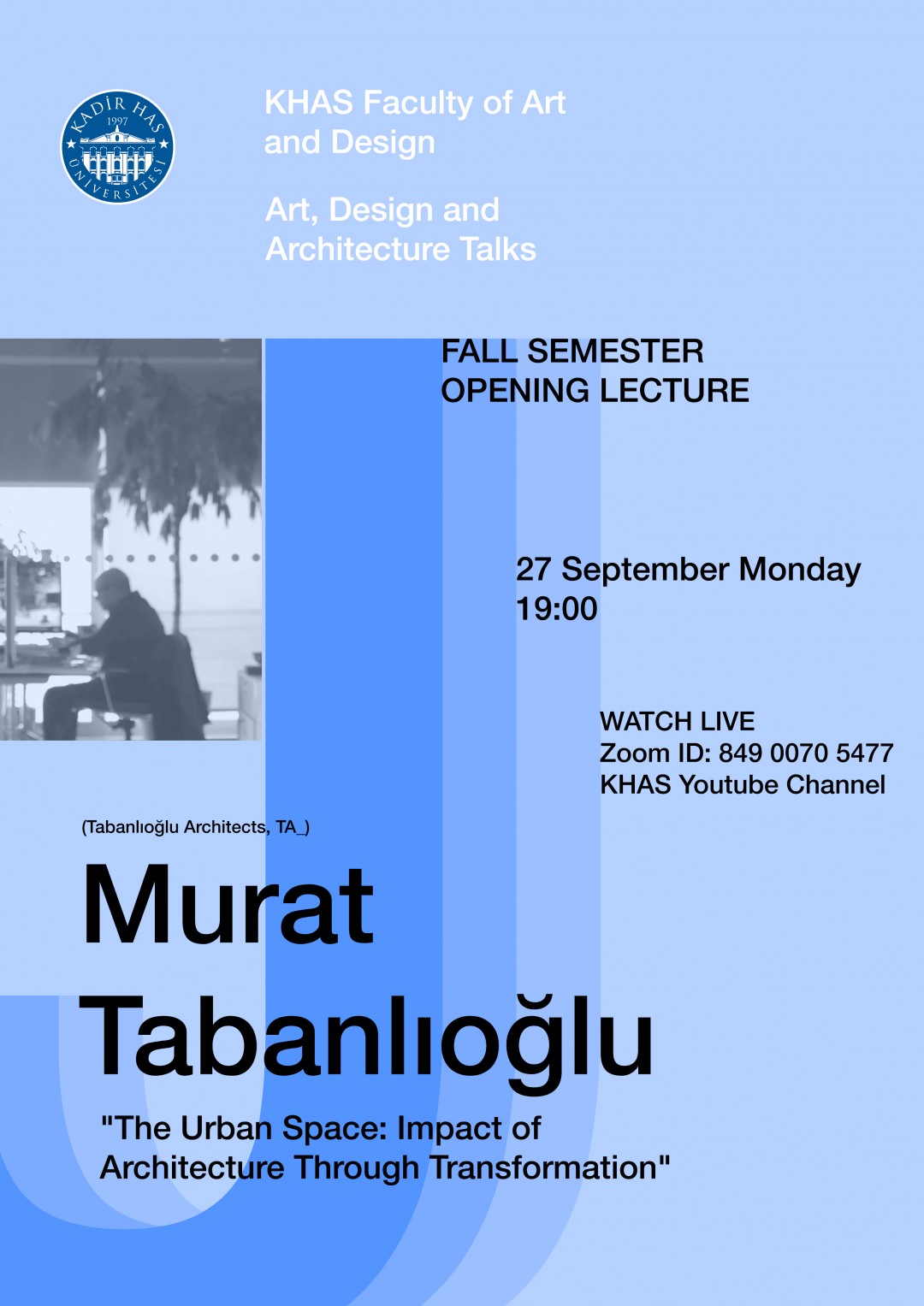 Kadir Has Üniversitesi Sanat ve Tasarım Fakültesi yeni akademik yıla çarpıcı bir seminer ve etkinlik serisi ile giriyor: “Sanat, Tasarım ve Mimarlık Konuşmaları” başlıklı seri, ülkemizin ve dünyanın sanat, tasarım ve mimarlık gündemine dair güncel konuları masaya yatırıyor. 27 Eylül Pazartesi günü düzenlenecek açılış seminerinin konuğu, ülkemizin en önemli mimarlık ofislerinden Tabanlıoğlu Mimarlık’ın kurucularından olan ve KHAS Mimarlık ve Kent Çalışmaları Tezsiz Yüksek Lisans Programı’nın koordinatörlüğünü yürüten Murat Tabanlıoğlu.