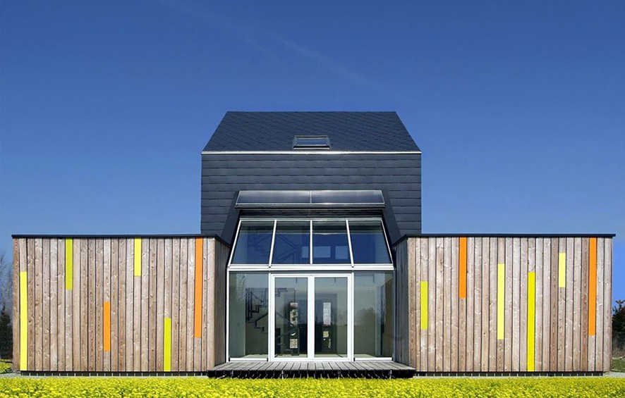 Bu sade, sürdürülebilir ev, tıpkı bir bukalemun gibi Laka Gölü’nün çevresiyle uyum sağlıyor. Ahşap cephe içindeki renkli plakalar, manzaraya hakim olan tonları yansıtırken, fibre cement levha ile kaplanmış dış cephesiyle, pencereleri kır yaşamından kareler sunuyor. Pek çok canlının fiziki yapısına benzer şekilde binanın dışı simetrik, iç mekânlar ise işlevine göre asimetrik biçimde tasarlanmış.