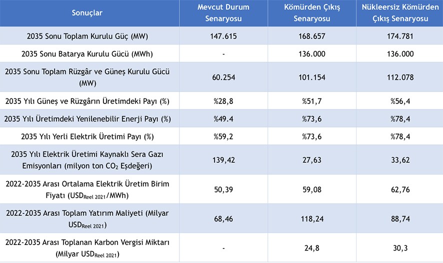 Kömürün Ötesinde Avrupa (Europe Beyond Coal), Avrupa İklim Eylem Ağı (CAN Europe) Sürdürülebilir Ekonomi ve Finans Araştırmaları Derneği (SEFiA), Greenpeace Akdeniz, WWF-Türkiye (Doğal Hayatı Koruma Vakfı), İklim Değişikliği Politika ve Araştırma Derneği ve 350.org için modelleme çalışmasını APLUS Enerji’nin yaptığı raporda, 2021-2035 dönemini kapsayan ‘‘mevcut durum’’, ‘‘kömürden çıkış’’, ‘‘nükleersiz kömürden çıkış’’ şeklinde 3 senaryo oluşturularak Türkiye’nin kömürden çıkış olanakları incelendi.