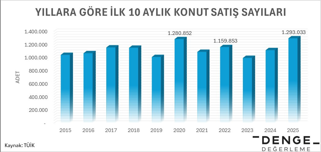 TÜİK konut satış verilerine göre her ay yaşanan artışlar ekim ayında da devam etti. Eylül ayında 150 bin 657 adet olan aylık konut satışı, ekimde yüzde 9’luk artışla 164 bin 306 adede yükselerek yıl içindeki yeni zirvesine ulaştı. Yılın ilk 10 ayı toplamında 1 milyon 293 bin 33 adet ile rekor sayıda konut satışı gerçekleşirken, bir önceki yılın aynı dönemine göre yüzde 16’lık artış yaşandı. Son 12 aylık kümülatif toplamlara bakıldığında ise 1 milyon 658 bin 684 adet satış sayısı kaydedildi. Konut satışlarındaki artışın yıl sonunda da devam etmesini beklediklerini belirten Denge Değerleme Genel Müdür Yardımcısı Latif Aksoy, “Herhangi bir sürpriz yaşanmazsa 2025 yıl sonunda en yüksek yıllık konut satışı rakamına ulaşılacaktır.” dedi.