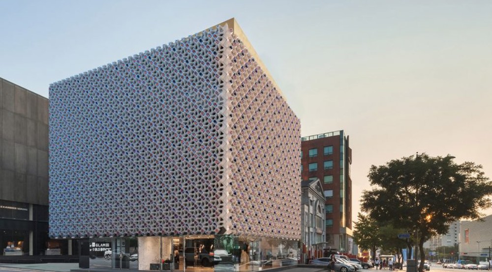 Sürdürülebilir cephe sistemi 2021 Mimari Seramik Montajları Atölyesi için Buro Happold Cephe Mühendisi Spring Wu ve Cookfox Architects Kıdemli Yardımcı Spencer Lapp tarafından geliştirildi. Bir araştırma atölyesine katılan Parnther, Lapp ve Wu, heykelsi pişmiş toprak cephe panellerine yerleştirilmiş kayar döküm kabuklardan bir mozaik sistemi geliştirdi.