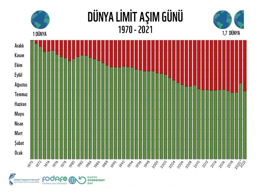 Birleşmiş Milletler Ekosistem Restorasyonu 10 Yılı’nın başlatıldığı 5 Haziran Dünya Çevre Günü’nde de vurgulandığı gibi, pandemi sonrası toplumsal ve ekonomik iyileşme ancak ekolojik kaynakların verimli kullanımıyla mümkün olabilir. Oysa insanlık bugün gezegenimiz üzerindeki ekosistemlerin yenileyebileceğinden %74 daha fazla kaynak kullanıyor. Bir başka deyişle 1.7 Dünyamız varmış gibi tüketiyoruz. Tüketim hızımız Küresel Limit Aşımı’nın hesaplanmaya başlandığı 1970’lerden bu yana en yüksek seviyeye ulaşmış durumda.