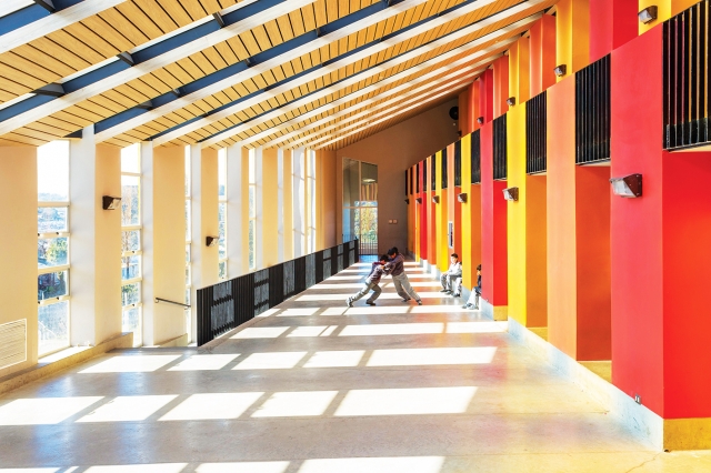 Kolonadlar, liman şehirlerinin geleneksel mimarisinde rastlanan; tekrarlayıcı, açık manzarayı, bulutlu gökyüzünü ve gün ışığı görmeyi sağlayan mimari bir çözüm. Bu kaynaklar her zaman sürdürülebilir mimarinin ifade ediliş şekillerinden biri olmuştur; çünkü kolonad alanlar oturmaya elverişli bölgelere termal kontrol sağlar. Bu okulda kolonadlar öğrencilere “sıcak ve samimi” bir yaşam alanı sunmak üzere kullanılmış.