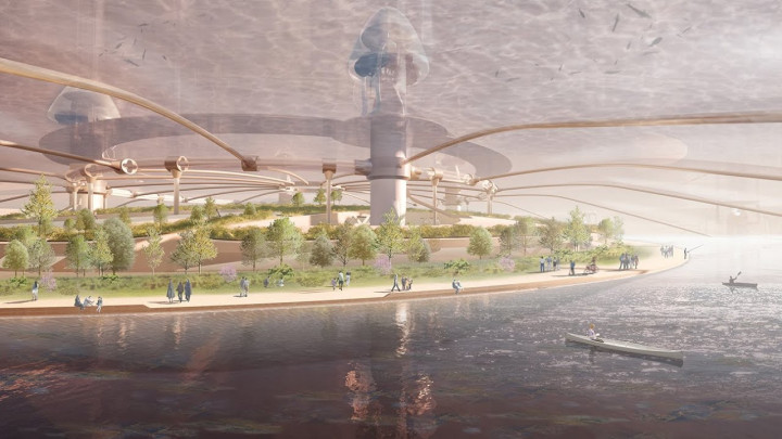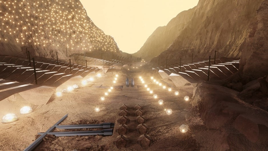 Uçurumun eteğinde yarı saydam bir yüzeye sahip büyük bir pavyon, Mars manzarası ve kanyonda sosyalleşmek için alan sunuyor. Kubbeler büyük bir sarkan kanopi ile dış radyasyondan korunuyor. Uçurum kazılarından elde edilen malzemeler çatıya atılır ve radyasyondan korunuyor. Aynı zamanda bu strateji büyük ölçekli geri dönüştürülebilirliği garanti ediyor.