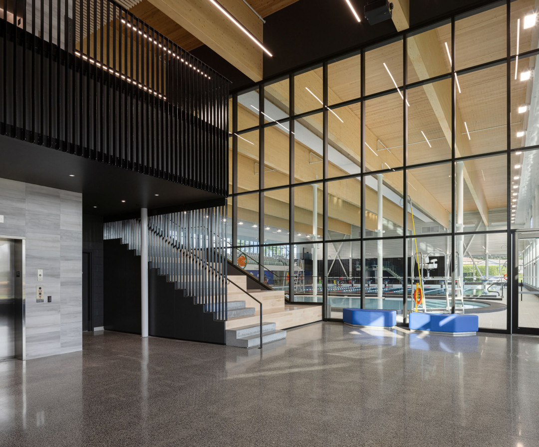 Ahşap bir merdiven, kademeli oturma düzeniyle sosyal etkileşimi teşvik ediyor ve havuz alanına bakan manzara dikkat çekiyor. Binanın birinci katında derslikler ve çok işlevli odalar, bir izleme galerisi ve tribünler (havuz alanı için 250 koltuk kapasitesi, spor salonu için 100 koltuk kapasitesi) yer alıyor.