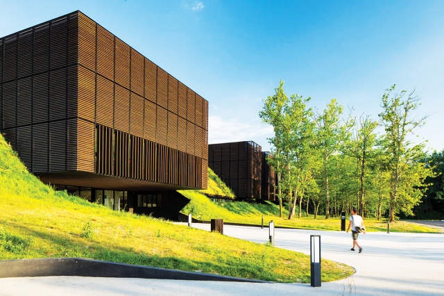 6404 m2’lik yapı birkaç yüzyıllık meşeler ve uzun çam ağaçları ile dolu korunan bir ormanın (Natura 2000 etiketli) ağaçları ile çevrili. Sanki peyzajın bir parçasıymış gibi bölünen bireysel bloklardan oluşan girişten bakıldığında arkadaki yamaç tarafında kalan orman görülebilmekte.