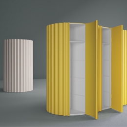 Aykut Erol’un tasarladığı ‘Wall’ metal dolap yan yana gelebilen ünitelerle devamlılık sağlarken hem soyunma dolabı hem de bölme duvar olabiliyor. Wall dolabının en önemli özelliği; klasik bir soyunma dolabının daha farklı nasıl tanımlanabileceğini ve bir soyunma dolabına farklı ve yeni fonksiyonların nasıl eklenebileceğini gösteriyor olması. Wall aslında bir depolama ünitesi fakat akustik anlamda bir bölme duvara dönüşebiliyor ve aynı zamanda kendi içinde bir kutucuk haline gelebiliyor.