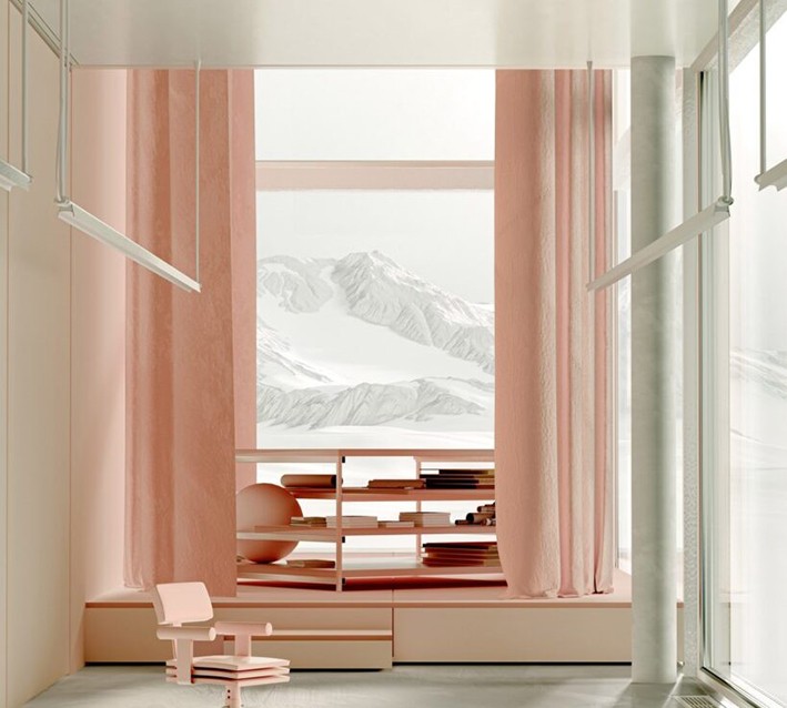Dieter Rams'ın 1960'ların başındaki tasarımlarından ilham alan metaverse Kış Evi, topraktan fışkıran büyük bir beton yapı ile destekleniyor; heybetli yüzer zemin, alana nüfuz etmek için doğal ışığı davet eden cam duvarlarla yan yana konuluyor. Bu şekilde, metaverse Kış Evi, açık zemininden tavanına ve pencerelerine kadar, doğanın kendisini evin ayrılmaz bir parçası haline getiriyor. Kış Evi’nin zıtlıkları ve ikilikleri arasında, mahremiyet ve inziva etrafında dönen farklı bir yaşam alanı yaratmak için hayati unsurlar yer alıyor. Kış Evi’nin çeşitli alanları, açık ve kış manzarasının içine dalmış görünecek şekilde tasarlanırken, aynı zamanda bir yakınlık ve sıcaklık hissi de aktarıyor.
