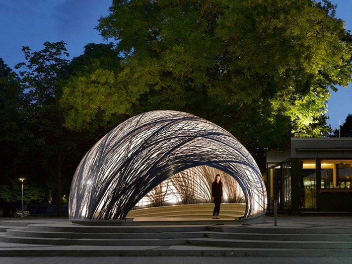 2015 yılında inşa edilen ICD/ITKE Araştırma Pavyonu, bir su örümceğinin su altı yuvası yapımından ilham alan devrim niteliğinde bir bina yaklaşımının mimari olanaklarını göstermektedir. Yenilikçi robotik üretim teknikleri sayesinde, başlangıçta esnek olan bir pnömatik kalıp, içeriden karbon fiberlerle güçlendirilerek kademeli olarak güçlendirilir. Bu fiber takviyeli yapı için tasarım yaklaşımı, biyolojik inşaat süreçleri araştırmasına dayanmaktadır. Ortaya çıkan hafif fiber kompozit kabuk, aynı zamanda malzeme açısından oldukça verimli ve işlevsel olarak entegre bir yapı olurken, farklı mimari özelliklere sahip bir pavyon oluşturur.
