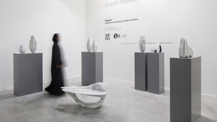 Dijital, esnek ve hassas oymacılar olarak hizmet veren robotlar, olağanüstü nesneler yaratabilir ve taş gibi kolayca algılanabilen katı nesneleri akışkan, organik ve hafif nesnelere dönüştürmek için teknolojiyi kullanabilir. Layth Mehdi tarafından tasarlanan resimli koleksiyon, robotik uygulamalarla frezelenen ve algoritmalar kullanılarak geliştirilen bir dizi mermer vazo ve kavisli masadan oluşuyor. Eserler dalgalı yüzeylere ve 7 eksenli robotlar kullanılarak kesilen akıcı şekillere sahiptir. Akan şekiller, tasarım aşamasında dijital modelleme ve komut dosyası yazılımının bir karışımının üst üste bindirilmesiyle oluşturuldu.