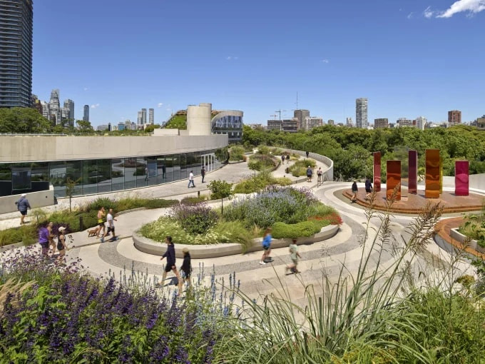 Yapının en dikkat çekici unsuru, yerel bitkilerle zenginleştirilmiş 3.700 m2’lik çatı parkı. Yürüyüş ve bisiklet yolları ile çevredeki mahalleleri birbirine bağlayan bu yeşil alan, kamuya açık bir mola ve buluşma noktası işlevi görüyor.