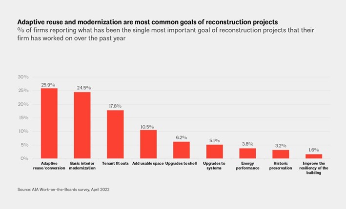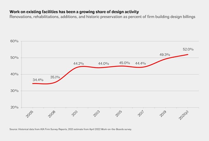 AIA'nın 20 yıllık renovasyon, güçlendirme, restorasyon ve yeniden işlevlendirme sürecini takip eden verilerine dayanarak, mimarlık firmalarındaki yeniden işlevlendirme projelerinin faturaları ilk kez yeni inşaat projelerinin faturalarını aştı. AIA'nın Baş Ekonomisti Kermit Baker'a göre önemli olan, bu denge değişiminin pandemiyle beklenmedik bağlantıdır.