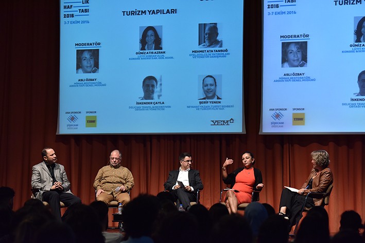 YEM Mimarlık Haftası etkinliklerinin üçüncü gününde “Turizm Yapıları” paneli gerçekleştirildi. Argos Yapı Genel Müdürü, Mimar ve Restoratör Aslı Özbaymoderatörlüğünde yapılan panelde; Lütfi Kırdar Uluslararası Kongre & Sergi Sarayı Genel Koordinatörü Güniz Atıs Azrak, Otel, Otelcilik Yatırımları ve Yönetim Danışmanı Mehmet Ata Tansuğ, Delicias Travel & Incentives Ortağı ve Yöneticisi İskender Çayla ve Seyahat Yazarı, Turist Rehberi ve Turizm Filmleri Yapımcısı Şerif Yenen deneyimlerini aktardı.
