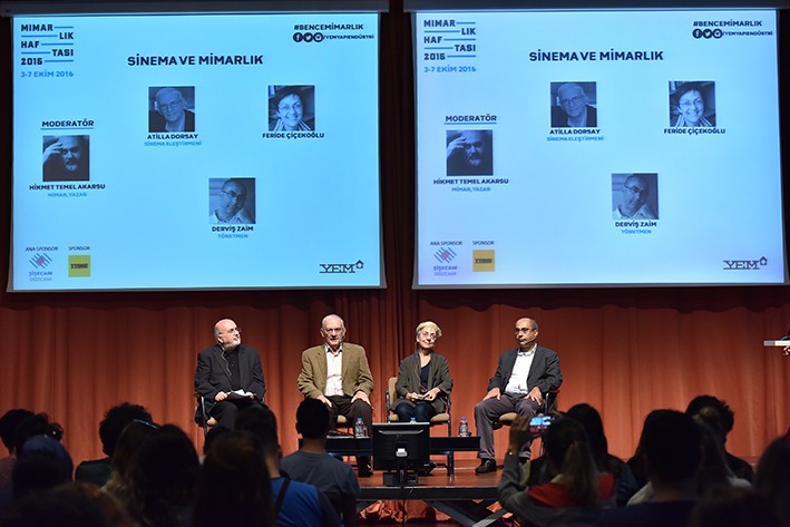 YEM Mimarlık Haftası etkinliklerinin son oturumunda mimarlık ve sinema konuşuldu. Mimar ve Yazar Hikmet Temel Akarsu’nun moderatörlüğünde gerçekleşen oturuma Türk Sinema Eleştirmeni Atilla Dorsay; Mimar, Senarist, Akademisyen Feride Çiçekoğlu ve Yönetmen Derviş Zaim katıldı.