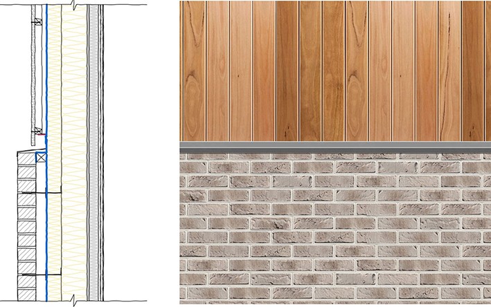Ahşap profillerin tuğla duvarın daha gerisinde yer aldığı bir görüntü veya detay elde edilebilir. Bu yöntemle tasarlanan havalandırmalı cephe kaplamasında ahşap profiller için, tuğla duvarda daha fazla derinlik sağlamak gerektirecektir. Bu şekilde kaplama, tuğla duvardan daha geride olacaktır. Bu yöntem özellikle cam için açılan boşluklarda kullanılabilir.