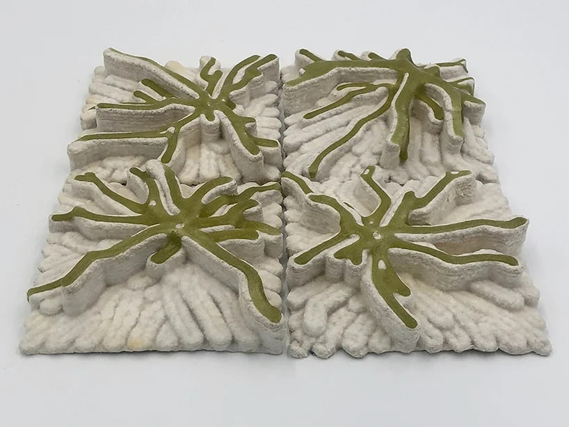 Daha fazla büyümeyi durdurmak için bioMATTERS parçaları konveksiyonlu fırınlara yerleştirmiş, burada kurutma ve dehidrasyon sonucunda sert, dayanıklı ancak hafif bir malzeme elde etmiştir. Son aşamada hasat edilen alg biyokütlesinden elde edilen biyo-pigmentlerin uygulanması yer alıyor. Jellere dönüştürülen bu pigmentler, estetik bir iyileştirme olarak renk katmak için her bir karo üzerine 3D olarak basılıyor. Tamamlanan MYCO-ALGA karolar, kirli beyaz miselyum ve açık yeşil alg tonlarıyla iç mekanları dönüştürüyor, yumuşak, kadife benzeri bir doku ve farklı bir dokunsal kalite sunuyor. Her bir karo misel büyümesini yansıtan, hesaplamalı olarak oluşturulmuş dallanma morfolojilerine dayanan farklı ve tekrar etmeyen şekillere sahiptir. Bir yüzey üzerinde bir araya getirilen karolar, sürekli desen varyasyonlarından oluşan görsel olarak ilgi çekici bir mozaik oluşturuyor.