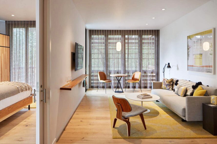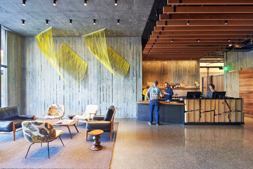 Proje sahiplerinin bu doğal yaklaşımı binaya girdiğiniz andan itibaren kendini gösteriyor. Yapılan tasarım sürdürülebilir ulaşımı teşvik etmiş; otelin dış cephesine inşa edilmiş üstü kapalı bir otobüs durağı, ayrıca misafirlerin kullanımına açık bir dizi bisiklet mevcut. Resepsiyon masası bile yere düşmüş, tek parça bir okaliptüs ağacından yapılmış.