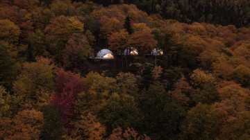 Büyük camlı giriş, sadece cila atılmış beton ve süslemesiz ahşap paravanlar, doğal olmanın da dekorasyon ve süsleme kadar güzel olduğunu hatırlatır nitelikte.